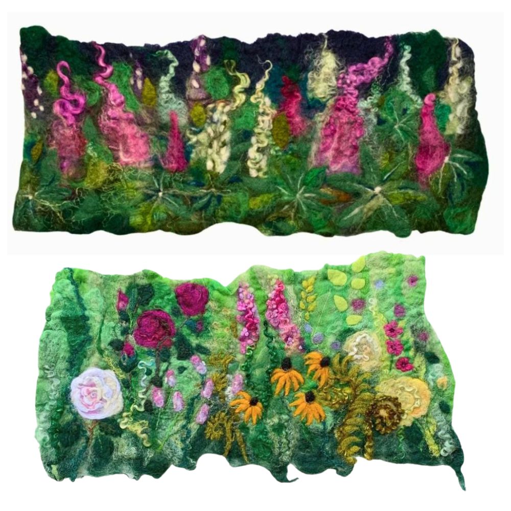 Explore the magic of wet & needle felting by first learning about the wools and textures and how they can achieve different effects in your finished piece. Choose from lots of colourful Merino wool, silk fibres, wool curls, skeleton leaves and other fibres to create your palette for your garden picture. Learn how to layer these wools and textures to create depth and realism in your garden picture. Feel free to bring photos/magazines for inspiration, I will bring lots too. I will have lots of examples of my work to look at plus lots of experience creating floral art to help you achieve your piece.