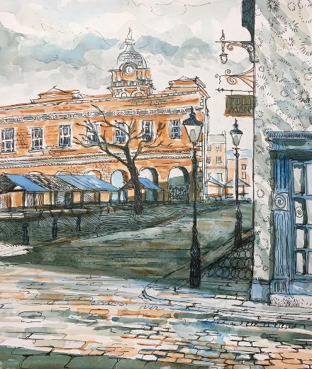 We will invent a variety of different marks with our pen to bring interest to this Wintery view of Chesterfield market place. Using a very simple palette of just two colours, you will use this restriction to help you focus on the main subject and give a loose, sketchy feel to this otherwise complicated view, focussing more on the temperature and values of your paints.