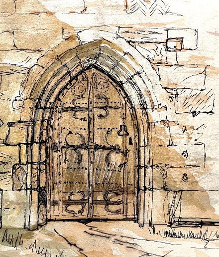 Ths lovely stonework is brought alive by the use of a sepia shadow - and all those small details in the studs, crusty metalwork and textured carvings... how best to describe them with nothing but a pen and a simple palette of watercolours? We will use a selection of different marks with our pen to bring out the character of this old doorway. Using a very simple palette of limited colours, you will use this restriction to help you focus and use the overlapping shadow to throw the sunlight casting across your work.