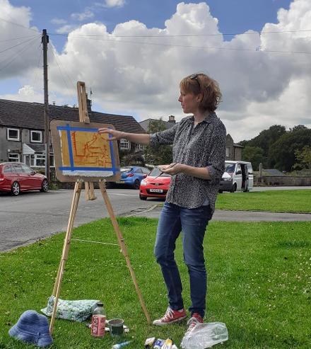 Below - colourful indoor painting fun, and a quick demonstration out in the village while the sun shines